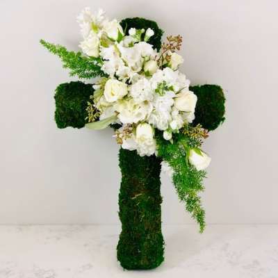 This moss covered cross has attached an arrangement of flowers and greenery. We can provide a colorful display or an all green and white arrangement (as shown). Please specify in the space provided below your flower color preference.