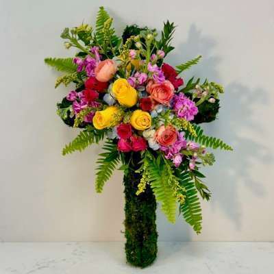 This moss covered cross has attached an arrangement of flowers and greenery. We can provide a colorful display (as shown) or an all green and white arrangement. Please specify in the space provided below your flower color preference.