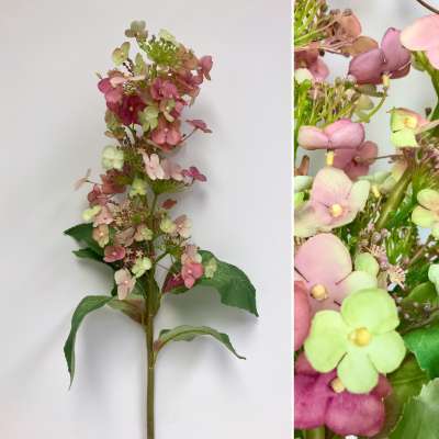 This silk hydrangea is a 30″ stem length with leaves and has the look of an oak leaf bloom with tones of pink, cream and green colors.